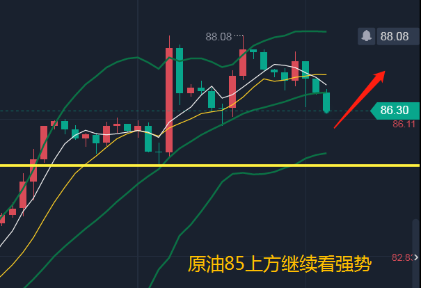 原油昨天整体走势震荡偏弱,很明显的上涨开始发力,88附近的阻力多次试探不破说明有效。但日线上并不弱势,而日线的均线是有回落的需求去试探MA10附近,具体怎么个试探法还要看临盘走势,有可能86就走反弹也有可能85走反弹。而H4方面目前是一个空头排列走势,所以做多不着急,耐心等待油价回落然后再依托日线MA10去看涨就好。老规矩,只要在85.5附近出现急跌探底,我们都是可以开始尝试低多的,所以85.5和85分批多,损84.5,看86.5-87.上方阻力87.2附近晚间冲高可以短空一次!