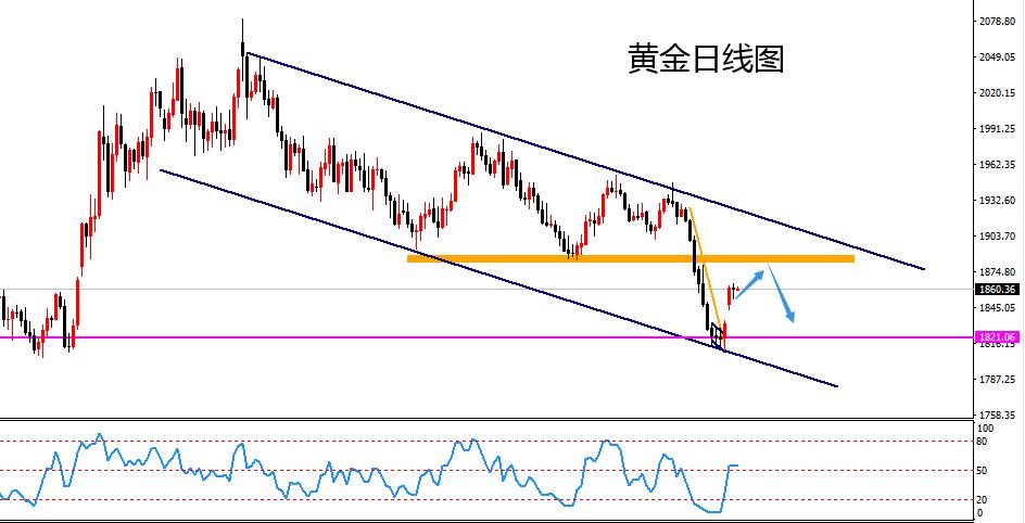 大周期上,目前黄金依然处于下跌通道之中,上轨的压力不断下移,拖得时间越长,下跌的概率也越大。