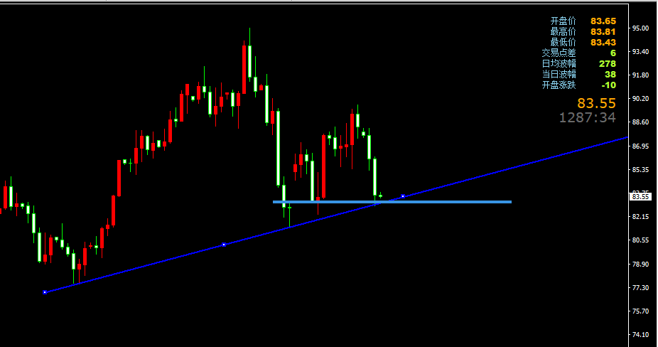 原油回踩82.8附近多,防守82,看85上方,反抽初见85附近空,防守85.8,看84下方
