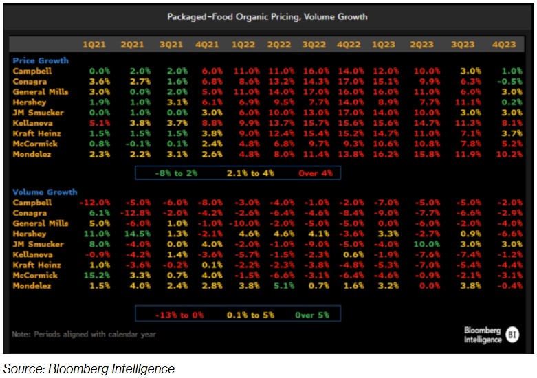 交易员密切关注包装食品股的原因也在于此。即使近年来销量下降,这些公司的销售额却因价格上涨而扩大。但事情从这里开始变得棘手起来。虽然放慢涨价速度一般会提高产品销量,但2024年需要在价格和销量之间取得更好的平衡,以支撑利润率,进而支撑股价。