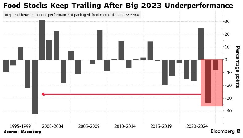 这也解释了为什么消费品行业的一个重要组成部分,即包装食品制造商在今年年初落后于标普500指数。该细分行业已经遭受了一段时间的打击,在2023年创下了20多年来相对大盘最差的年度表现。多家公司去年的销量下降幅度超预期,华尔街也愈发担忧,如果越来越多的人开始服用抑制食欲的药物,包装食品制造商可能会受到冲击。