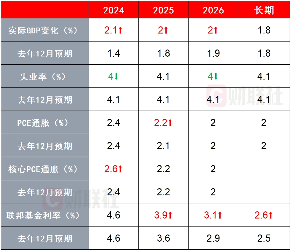 在美联储最新经济预测摘要(SEP)中,美联储上调了今年核心通胀和经济增速预测。其中,本期经济预期中,2024和2025年底核心PCE增速预期分别为2.6%、2.2%(去年12月预期分别为2.4%、2.2%);2024和2025年实际GDP增速预期分别2.1%、2.0%(去年12月预期分别为1.4%、1.8%);2024和2025年底联邦基金利率预期分别为4.6%、3.9%(去年12月预期分别为4.6%、3.6%)。