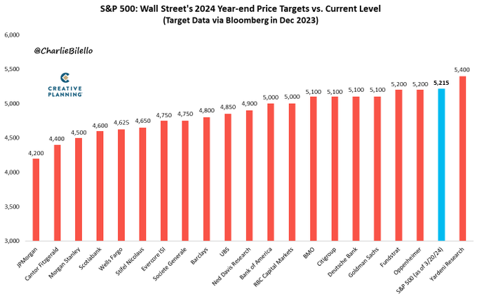 随着标普500指数升破5200点大关,其目前已经比华尔街策略师设定的2024年年底的平均目标价(4861点)高出了约7.3%。而要知道,2024年迄今才刚刚过去了不到三个月。