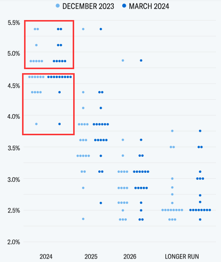 但好在,FOMC委员们对2024年底联邦基金利率的中位数预期依然维持在4.6%。这个持平于12月的数字,掩盖住了上述点阵图细节的微妙变化。