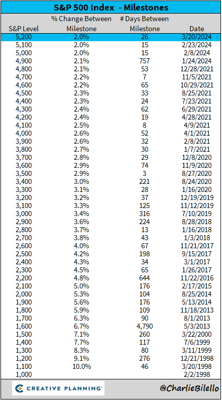 同时,标普500指数从站上4900点到如今逾越5200点——升破三道百点大关,总计只花费了56个交易日,其上涨速度毫无疑问也堪称惊人。从去年10月的低点以来,标普500指数的累计涨幅已经超过了千点。