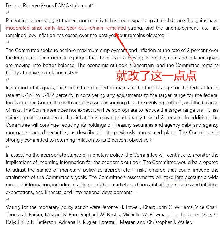 这也是美联储连续第五次会议一致决定将利率维持在5.25%-5.5%的范围内,并重申将等到对通胀更有信心再降息。