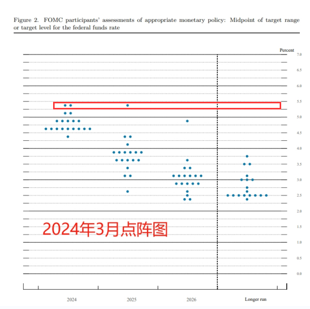因为在这张点阵图上,有两个最鹰派的“点”(官员)预期,今年美联储可能全年都将会把联邦基金利率目标区间维持在眼下5.25%-5.50%高位的。甚至于,其中一位“鹰王”认为美联储到明年底都不会启动降息。