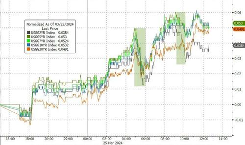 在美债市场上,各期限美债收益率周一整体波动有限,投资者在复活节前短交易周的首个交易日交投意愿并不高。截止纽约时段尾盘,2年期美债收益率上涨3.4个基点报4.638%,5年期美债收益率上涨4.4个基点报4.233%,10年期美债收益率上涨4.2个基点报4.248%,30年期美债收益率上涨3.7个基点报4.417%。