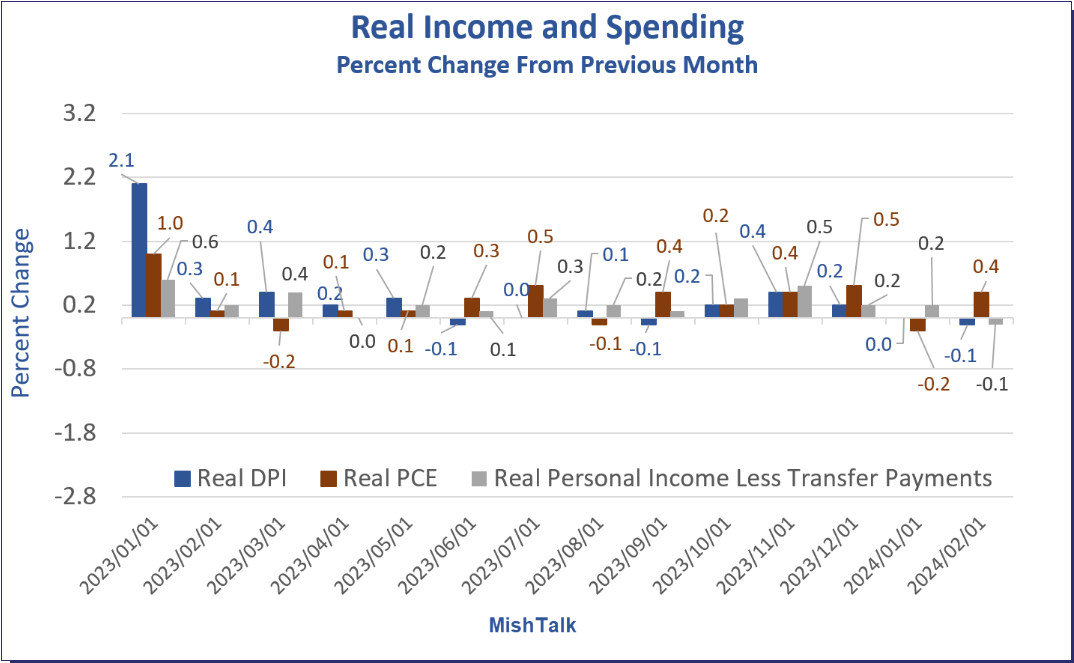 美国2月份个人收入月率增长0.3%;可支配个人收入(DPI,扣除个人当前税收后的收入)月率增长0.2%;实际DPI月率减少了0.1%;
