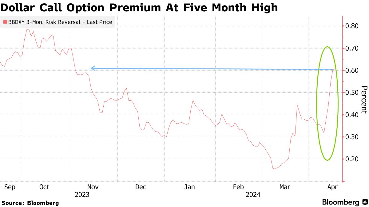美元看涨期权价值近期持续攀升,在期权市场押注美元进一步上涨的成本已升至去年11月以来的最高水平。背后的主要逻辑在于美国经济的强大韧性刺激10年期美债收益率回升,以及一部分避险资金因中东地缘政治冲突而买进美元,共同推动了市场对美元的强劲需求,强美元之势再度在外汇市场掀起波澜,且在第二季度可能将持续下去。