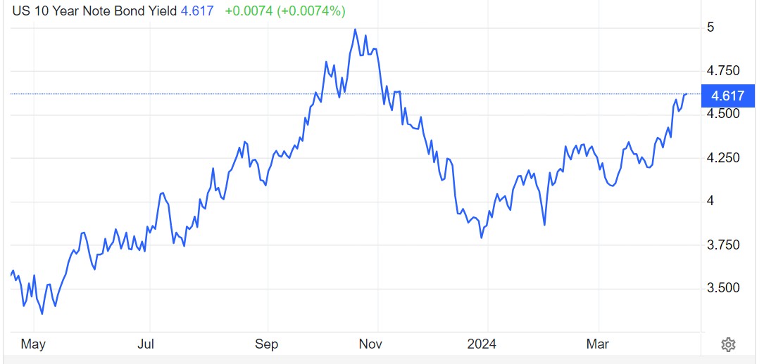 在火热的美国经济数据刺激下,美债市场对美国基准利率在“更长时间内保持在高位”(higher-for-longer)的激进预期发酵,有着“全球资产定价之锚”称号的10年期美债收益率从年初的3.8%附近攀升至周一的4.66%,促使全球资金兑换成美元以获取高收益率,进而不断刺激美元走高。