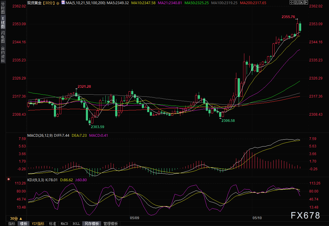 汇通财经APP讯——金价周五(5月10日)上扬,有望实现周线上涨,现货黄金一度创近三周新高至2355.76美元/盎司,目前交投于2349.63美元/盎司附近,因近期的经济数据促使交易商提高了对美联储今年晚些时候降息的押注。