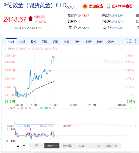 现货黄金涨势不止 向上触及2450美元/盎司续刷历史新高