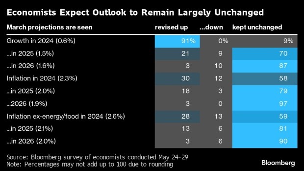 经济学家预计欧洲央行的最新预测不会有实质性变化,他们预计通胀将在2025年再次回到目标水平。然而,在欧元区第一季度国内生产总值(GDP)超过预期之后,今年的增长数据可能会向上修正。
