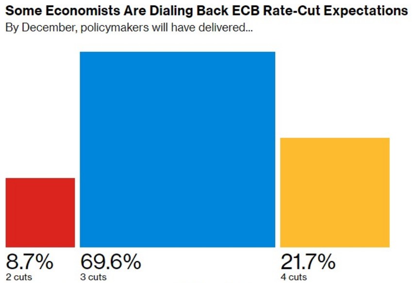 尽管大多数经济学家仍预计,在本周的首次降息后,欧洲央行将会按季度下调利率,但一些人认为,粘性通胀、快速的工资增长和意外强劲的欧元区产出将限制货币宽松。
