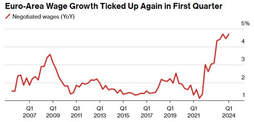 最新的经济报告提供了谨慎的理由。政策制定者原本希望欧元区薪资的一项关键指标显示通胀终于得到了控制,但却未能得到缓和,这表明价格压力,尤其是服务业的价格压力,可能需要更长的时间才能缓解。事实上,上个月通胀率从4月份的2.4%上升到2.6%,超过了分析师预期。