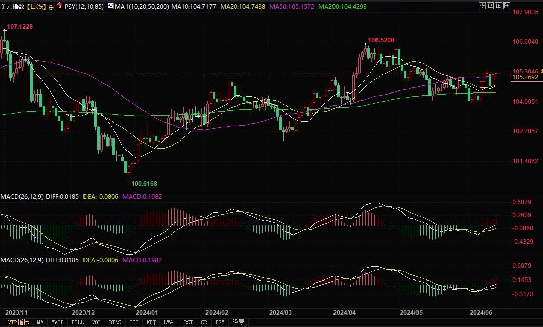 美元指数日线图北京时间6月14日9:05,美元指数报105.27