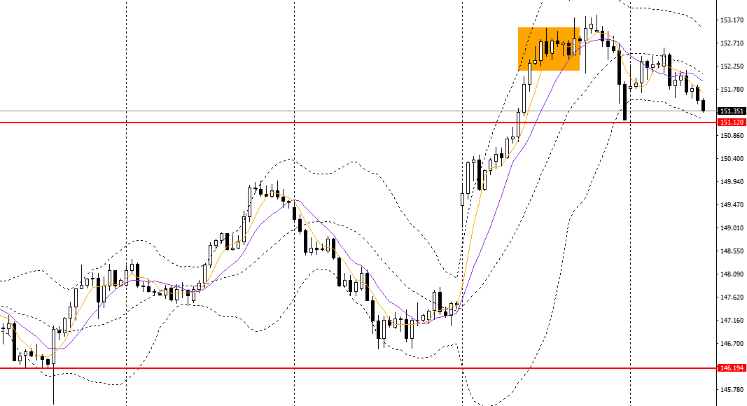 美日小幅阴跌,失守5日均线,4小时价格重心逐步降低,空单仍可持有,短线预计将继续回踩151关口。