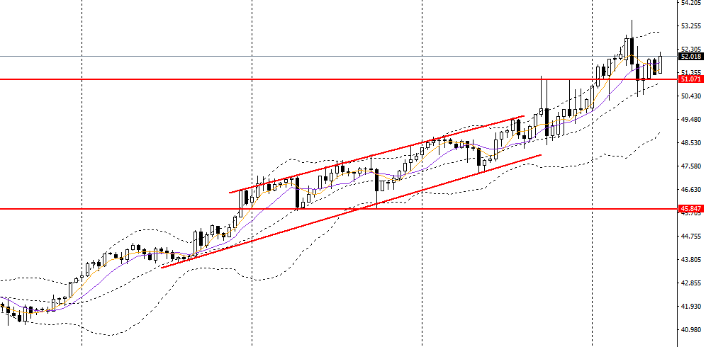 白银收长阴线,今日重新拐头上行,仍立于5日均线上方,日线RSI位于超买区附近,4小时多头力量减弱,但整体趋势仍偏强,51.20上方可延续多头思路。