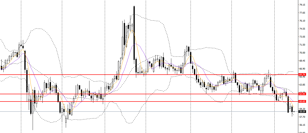 美原油跌破5个月来新低,日线RSI到达低位,60附近仍面临强压,空单可继续持有,如跌破前低,可下看至55-56一带。