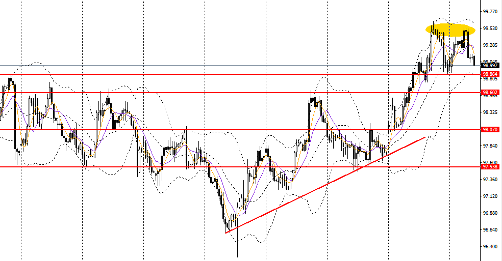 美元指数小幅收跌,徘徊于5日均线附近,日线RSI回落,4小时呈双顶,短线趋势偏弱,如下破98.80,后市预计将回踩98.60。