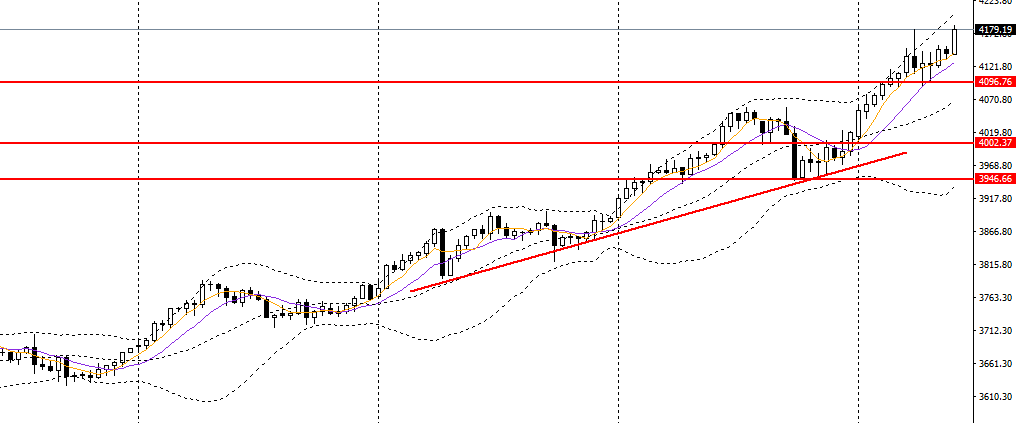 黄金维持单边升势,仍立于5日均线上方,日线RSI位于超买区,4小时再度站上4100关口,短线趋势仍偏强,如于4145-4150一带企稳可继续做多。黄金/人民币如回踩951-952一带企稳可进多。