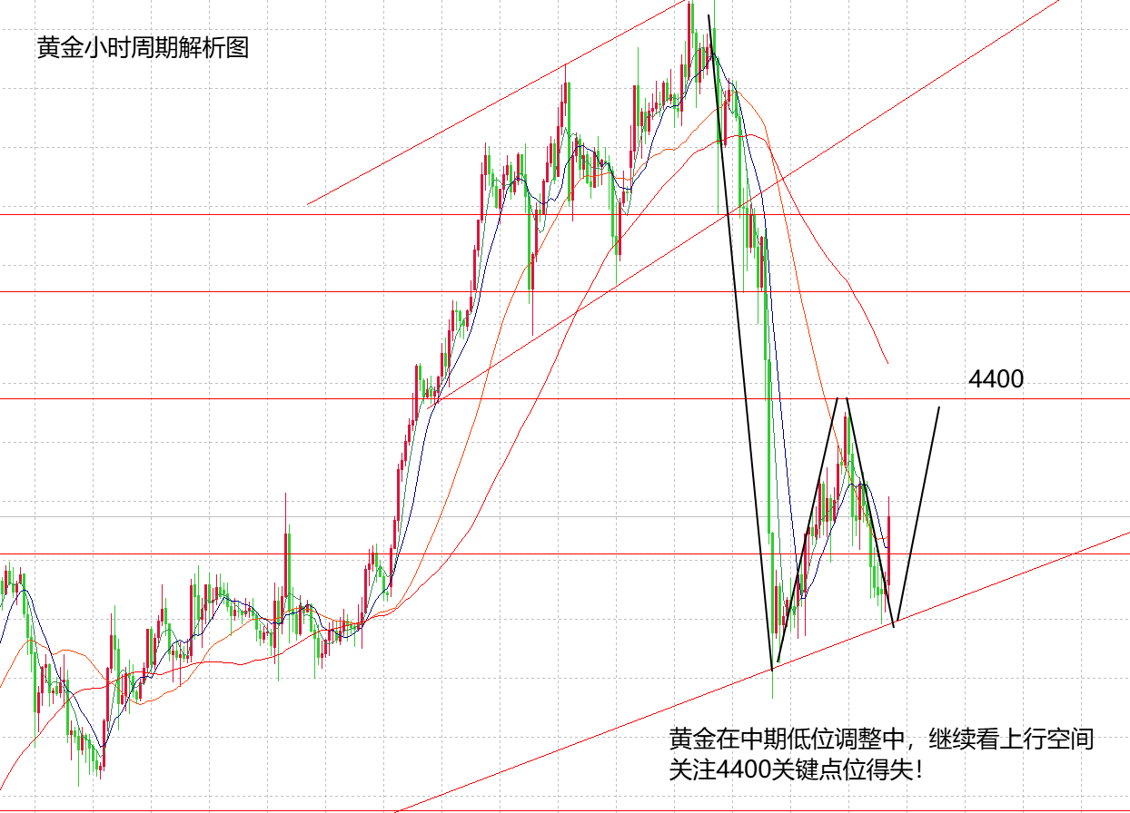 上个交易日黄金在大跌后反涨至4405,这波走势比较符合预期,山海从4340做多看涨到4400,美盘则从4400慢跌,再次回落到起涨点,但在大方向不变的情况下,未来还是可以站稳到4400之上,并且突破4400,看到4500,因此,尊重市场,目前黄金在4300之上,4400之下,看作是多头趋势下的震荡反弹行情。需要注意的是,只要大趋势不变,反弹随时会破位区间,并且跟随趋势走出破位力度。那么,周三的看法也是相当简单,在25年最后一个交易日中,继续看反弹的力度,关注上方4400高点得失。从技术面来看,日线依旧站稳在布林中轨之上,虽然周二没有收强阳,但也算是一个阳线,所以,目前还是强势,今天继续维持这个观点,看日线收线情况,如果继续走高,站稳4400之上,那么,上方4500就相当轻松。H4周期同样算是低位震荡了,没有强弱的绝对性,不过目前的反弹可能会形成底部形态,再等待多头结构后的放量空间。所以,震荡不可怕,可怕的是在震荡中没有拿住低多的布局机会。那么,这波调整山海还是强调,中长线继续维持4325的多单不变,短线的话每天都可以在小周期中做多看涨,比如周二4340做多看到4400,今天继续在4340做多看4400得失。元旦期间,外盘不停盘,周四,周五破位4400后再看趋势力度的大涨空间。