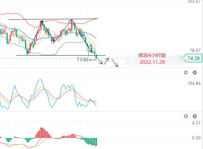 原油周评刚说到76一触即破,说时迟那时快,那么今日如期下破,在价格形成M形态后维持弱势下行,今日下方突破前面低点75关口最低至73.8一线,虽然大趋势依旧偏弱,但目前来看4小时图中价格远离5日均线并且依附于布林带下轨下方运行,一般这种情况不会持续很久,所以暂时下方不看太多,KDJ指标死叉放量,暂时震荡偏弱对待,下方继续关注72.4一线支撑,上关注76.5/78.1,大区间关注82.5-69.6一线.