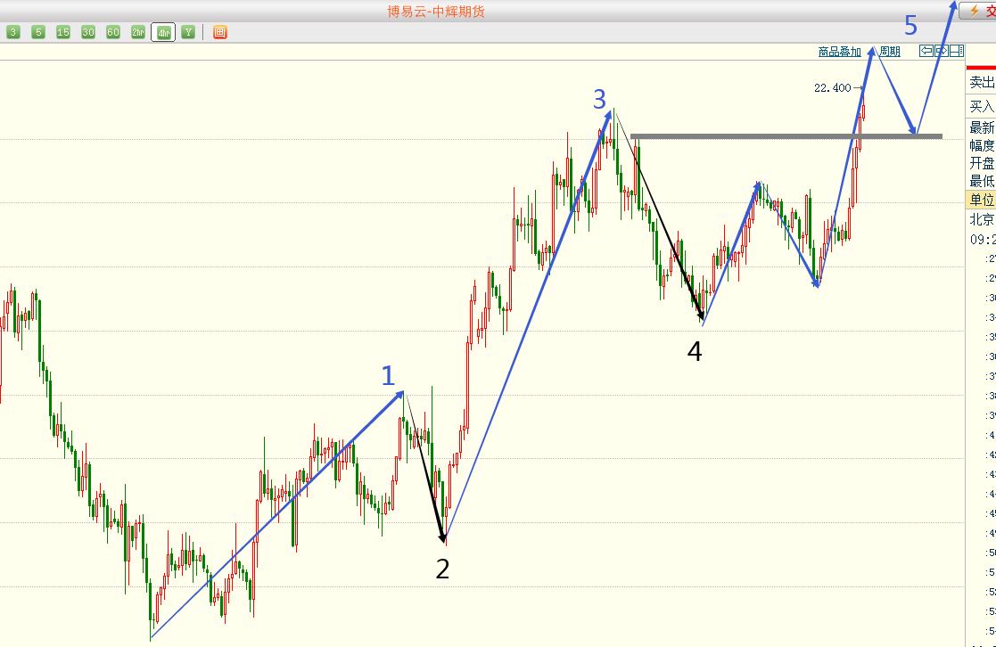 2、按照图灵波浪交易系统的更新,今日上破22.24意味着出现上行5浪结构,目前处于第5浪中的延长走势,具体细分位于5浪3的推动走势。