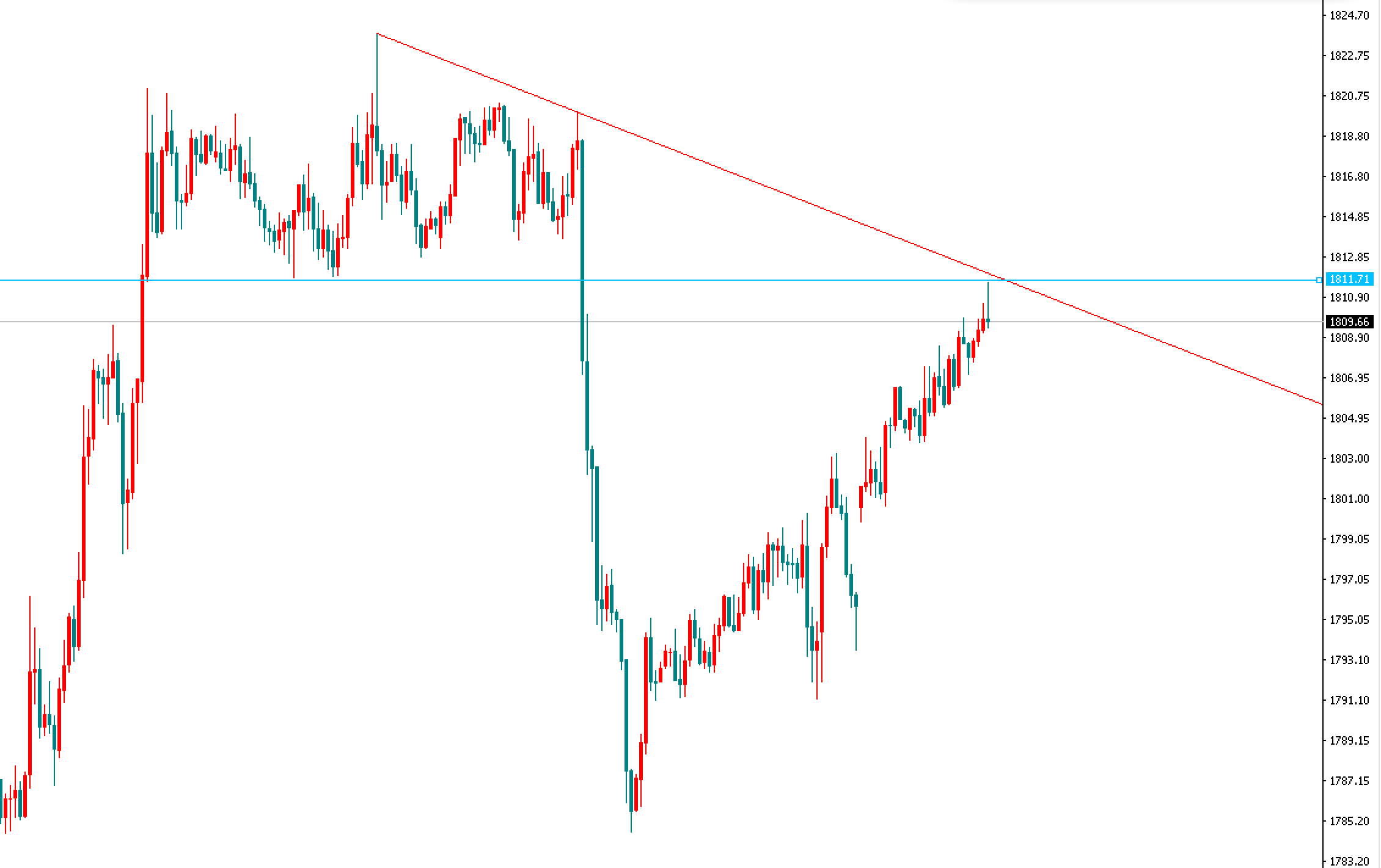 今天白盘黄金反弹看起来偏强,但是实际上没有空间,最多就是吓跑不坚定的空单而已。目前1811一线是上周四开跌口位置,而小时图下降趋势线压制正好形成!!!
