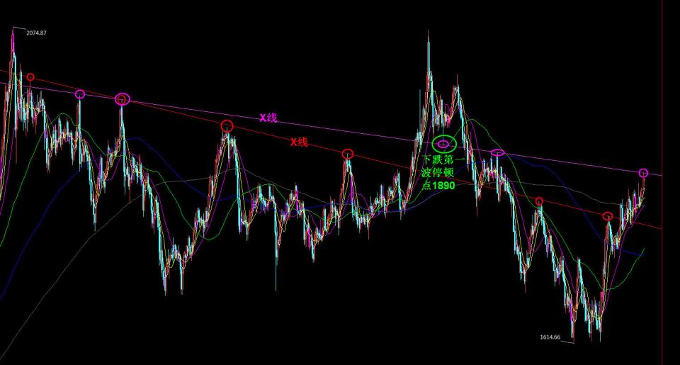 我们来看一下技术图走势,这是2075下跌以来的两条重要的X线,红色X线我们发现前后很多落点,1614低点之前的高点也是落在该X线上,1614上涨之后去年11月中也在该线产生了1786-1727的下跌。这就是X线的参照作用,紫色X线是即红色线之后的另一条X线,在过去一个月文章中多次提及,因此,我们强调1850是一个空位,昨天看的话先后压制下跌了两次。那后面1850依然显得很重要,关注是否突破,突破的话后市有望延续1870-1880的区间,后市进一步的重点就是1890/1895了,这是2070下跌的第一波停顿点,预计会压制行情产生相对大的回落。