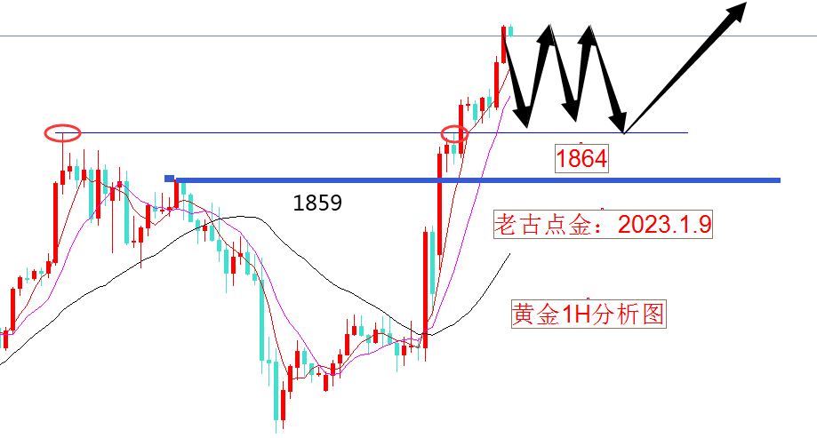 上周的黄金整体是多头行情,ADP和非农数据都出现利空,最终没有拦截住多头,多头先是挖坑埋人,最低触及到1825后开始一路飙涨,目前最高到了1879附近,这波多头超级强势,最终日线收阳包阴,周线还是收了一个大阳线,整体来看还是大多头,这波的多头目标直指1900,本周我们思路跟随多头继续看涨,以回踩做多为主,这周是艰难的一周,多头不会像上周那样直接涨,我们从形态是看周线已触及到了特大压力位1900下方,这带是曾经周线的高点和低点,周线在这带多空博弈是必然,我们谨防它出现大调整,我们在短线操作上还是需要做跟随,今天关注1864-1859一带的支撑,日内依托这带支撑做多。