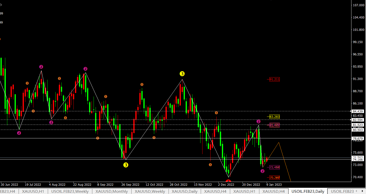 原油周线上周收线大阴柱,而指标macd死叉放量震荡,灵动指标sto勾头向下修复,代表着周线还是弱势格局。而短期周线压制在均线MA5和MA10附近对应76.5-77.7一线。因为均线MA5是微微向上运行,所以价格有所反弹。因此均线MA10就是强压制点77.7一线。
