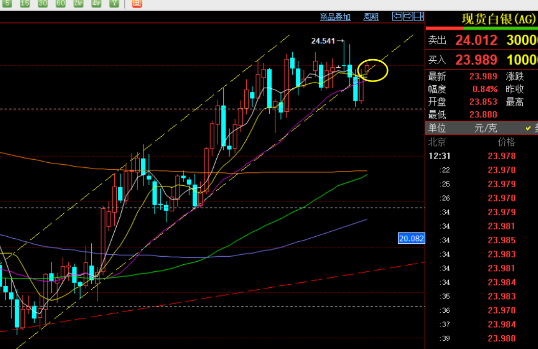 白银方面,明显弱于黄金,当前日线走法,处于通道下轨一线争夺,建议可观望一日看,就看是重回通道之内呢,还是压制通道下轨下运行; 短线阻力24.2、24.5,短期支撑23.6;