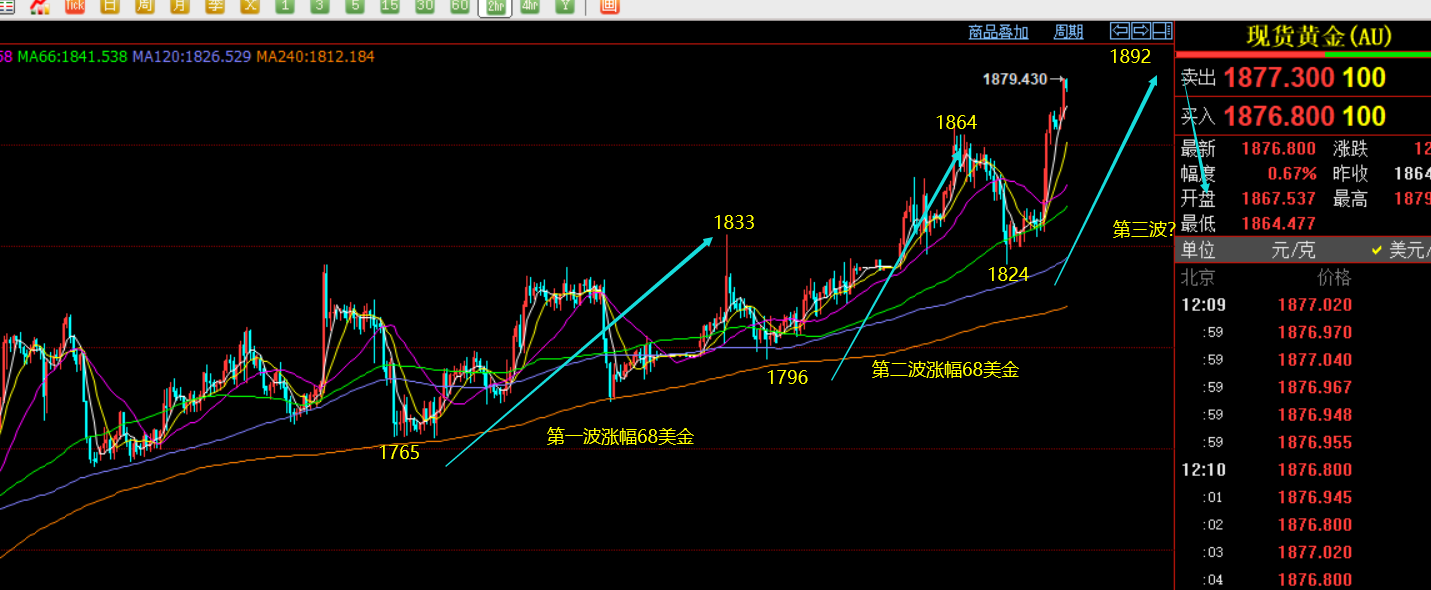 另外,日线大阳上攻,回调5均线和通道上轨支撑是1856一线,那么只要第三波1824起涨点不破之前,这一波的震荡拉升会延续,因此1856一线支撑还是可以试探的,若能先回踩可以考虑看震荡上行至1892处;这是今日两个关键多空点,先上还是先下来安排; 当前短线是延续上周五晚上震荡持续逼空状态中,若没有底仓多,一般是不敢去追涨,只能等两个关键点去下手试探;若有底仓多在,那么早盘直接破位的续涨有胆量去追博,当前压力关注1880一线争夺;