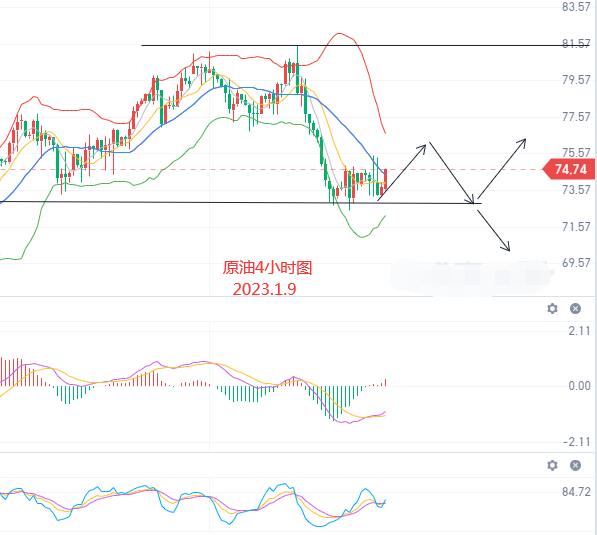 原油整体来看大趋势依旧偏弱,等待日线KDJ指标形成金叉价格才会开始波浪上行。从4小时图中来看布林带缩口,价格即将选择新的方向,KDJ和MACD形成金叉,日内先关注上行情况。小时图中来看布林带开口,KDJ和MACD形成金叉,短线来看价格仍有上行需求,日线继续关注上行情况。日内上方关注75.5/76.8/77.8一线压力情况,下方关注72.5/71.2/70,下周大区间关注83.3-62之间.