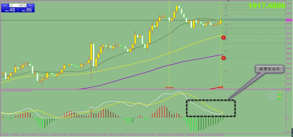 通过对黄金小时图解析得知,昨日行情如期在上方受阻回落,毕竟上方重压区没有特殊情况突破的可能性不大,从下方的MACD也可以清楚的看到到达上方压力位多头能量柱已经出现了缩短迹象,并且空头能量柱有所增加,今日空头虽然能量柱有所缩短但是还没有增强,从短期整体走势来看依然是在强势区运行,不排除进一步的上攻的可能性,下方我们重点关注1,2号均线的支撑,短期在操作上我们继续高空低多思路重点逢高做空,具体建议如下: