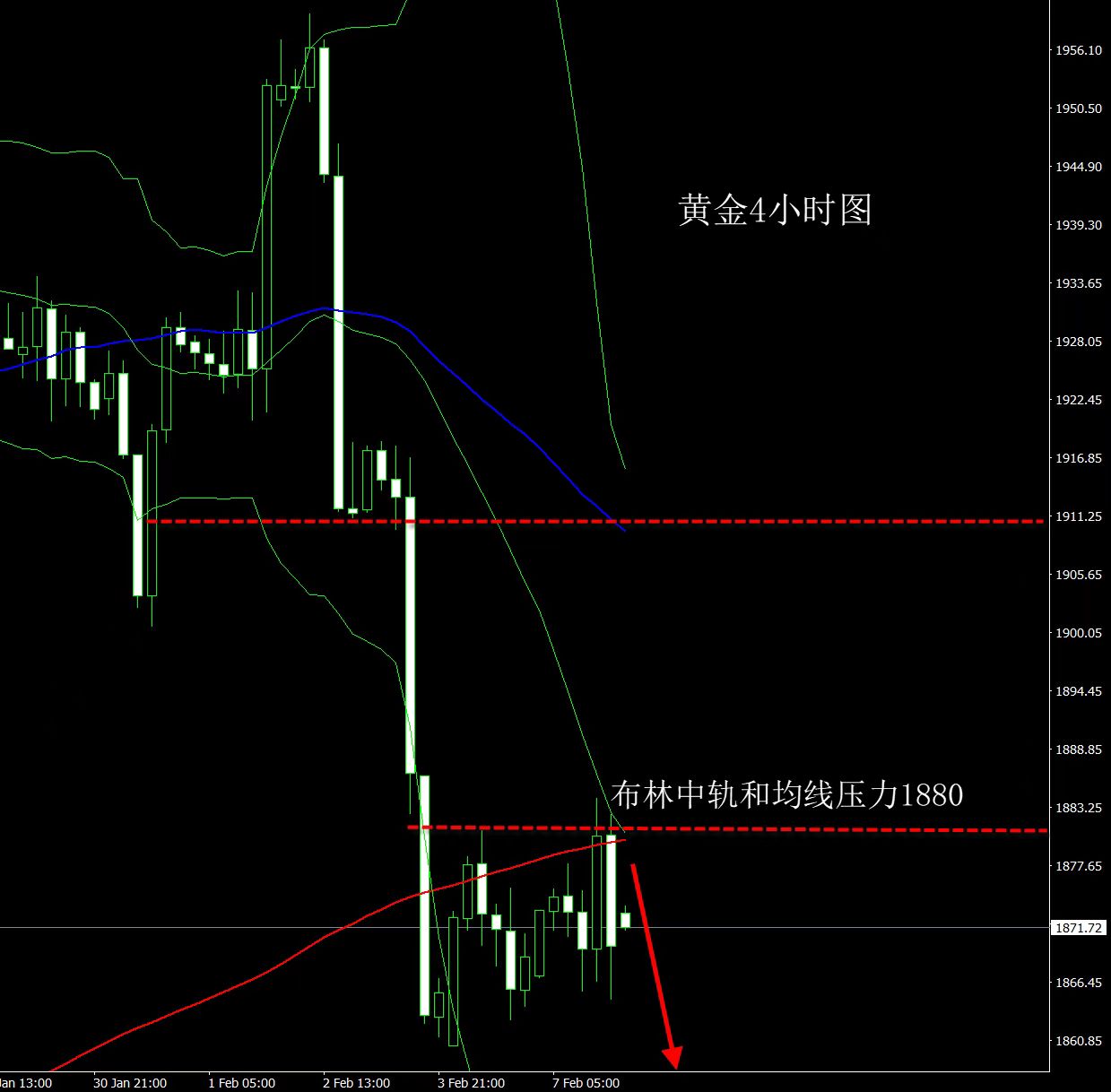 欧盘黄金还是继续做空,已经进场的继续持空看跌!下方支撑关注1860 破位后将跌向1850。