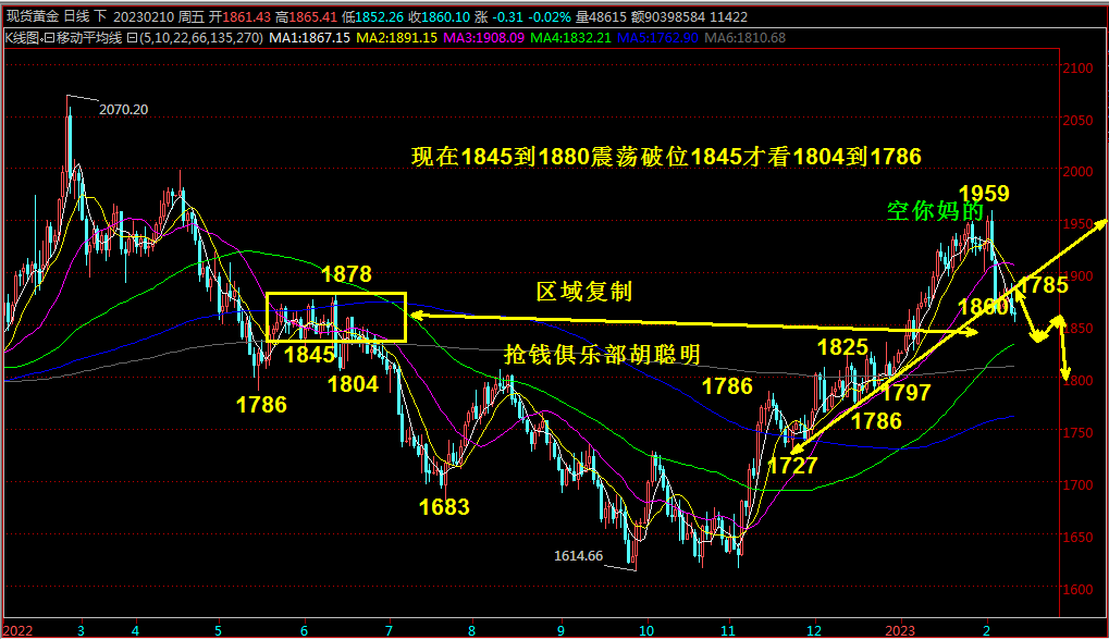 历史不会简单重复必有惊人相似,连续三天主力反弹冲高回落,昨日破位1860区域,说明空头再次控制盘面,现在破位1900和1880下面有成交密集区域的就是12月横盘上轨1825到1830区域,所以交易要有逻辑,顶底转换成交密集去K线是多空留下的痕迹,这个就是跟古代兵家必争之地,任何时候这里都是有争夺的,懂得人自然懂,今日开盘1861区域反弹10到15美金做空,基本遇到1870到1875区域就是空1884损目标1860到1845到1825到1800到1780,激进早上可以在1866附近轻仓布局做空1876损目标同上,做多等待惯性1825到1830区域甚至1835附近,我们肯定是要去择机做多的,当然中间有一个位置1845,。更多盘面我们随时更新思路。