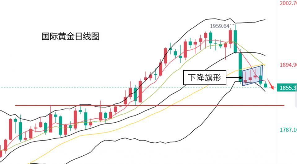 在技术层面,本周黄金止跌企稳后,走势呈现下降上飘旗形,这是一种下跌中继整理形态,多发生在金价快速下跌之后,由于短期内跌幅较大,金价受到多方反扑,表现出上涨迹象。黄金走势出现下降旗形,大多数情况都是向下突破,金价跌破通道下沿后,进一步下探新低,少数情况是金价突破通道上沿,加速向上拉升。周四金价下跌,也符合下降旗形金价向下突破的多数情况。