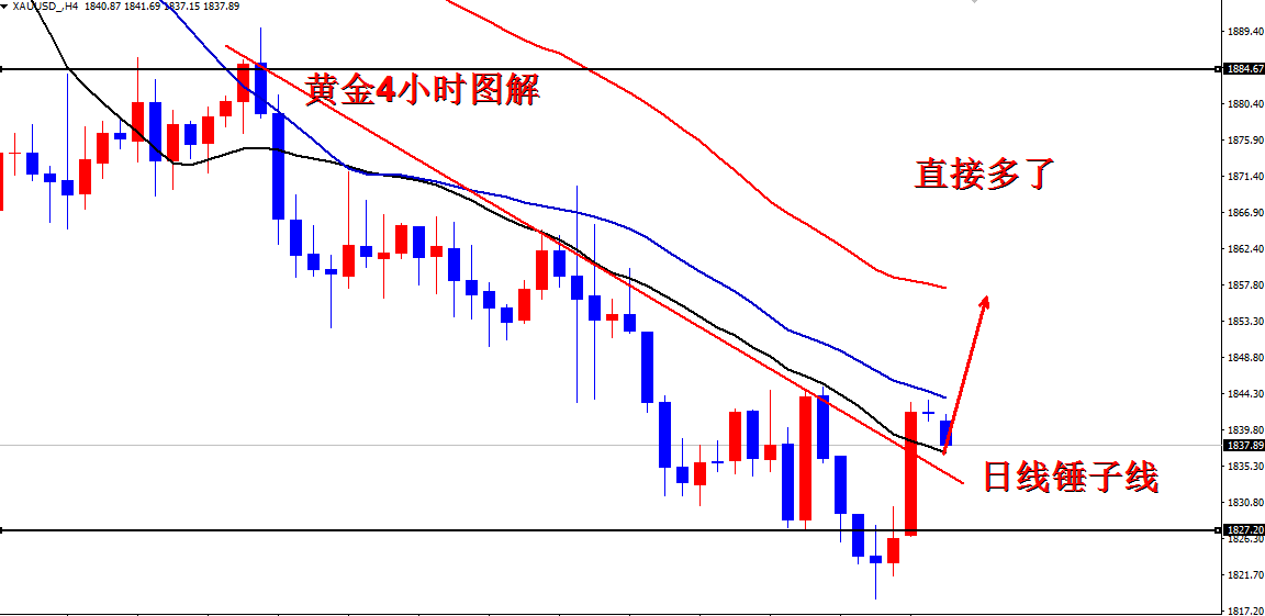 黄金大阳线拔高,已经突破了4小时周期20均线,黄金会继续上涨,目标1850。在黄金没有暴涨之前,我也曾不止一次地讲,黄金1827月线强支撑,也多次提示要进多单,行情已经大涨,多单大胜。日线黄金锤子线夯实1827月线支撑,两者结合更加坐实这一点,本周继续干多,将金价干到1880。