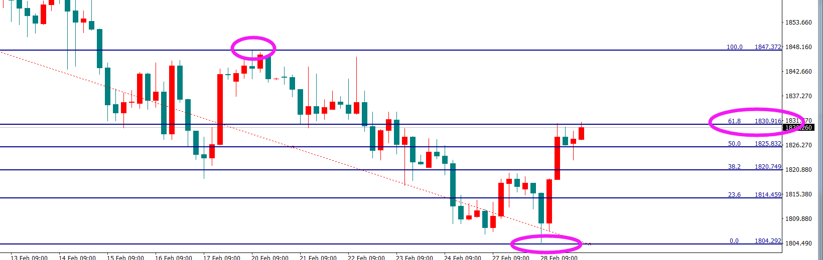 虽然昨天后半夜黄金没有形成冲高回落,但是目前1831一线则是1847-1804的黄金分割位61.8%位置强压。