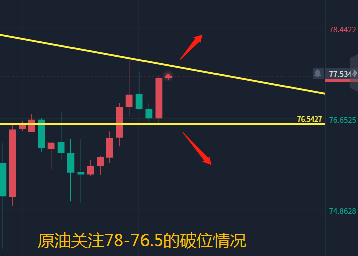 原油昨天整体走势很强,一路慢涨,虽然在触及77.7后出现回落,但目前行情再次走强,我们昨天给出的76.8和77.3也只是早间小利。对于目前的行情来说,多空皆有可能,目前形态来说,还是处于一个反弹当中,但从日线来看,上方下降趋势线的压力位于78附近,如果上破多头可能会延续,不破的话,反弹就会终止,日内的下方支撑在76.5,如果下破空头会再次来袭,不破继续看涨,所以日内可以看好78-76.5的破位情况,看涨的话可以在77-77.1附近去交易,止损方在76.5下方看78的破位。对于做空的话可以现价77.4-77.5空,防守放在78上方,看76.5的破位!只要破位都是可以顺势跟进!