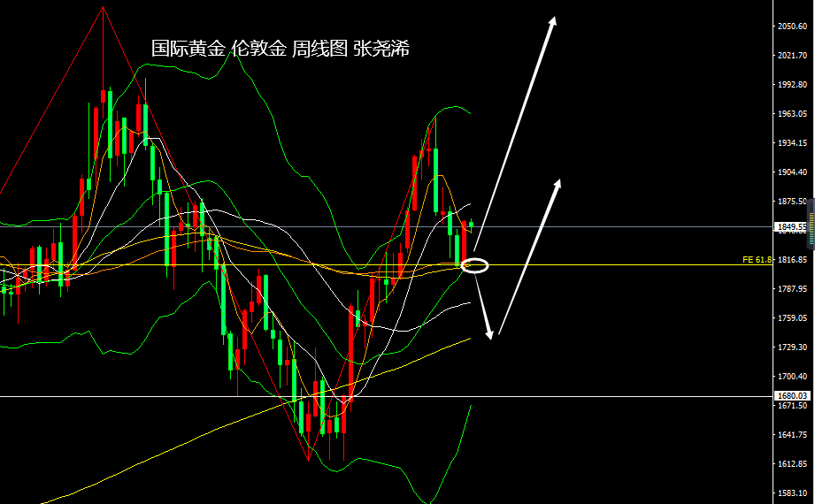 周线级别:金价上周在触及中轨及100周均线等支撑后展开止跌回升,目前也初步运行在5周均线上方,但上方也有10周均线阻力为突破,故此短线走势偏向震荡为主。