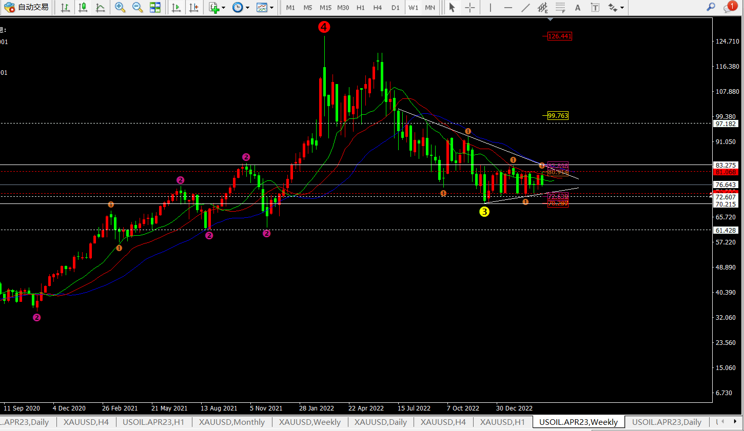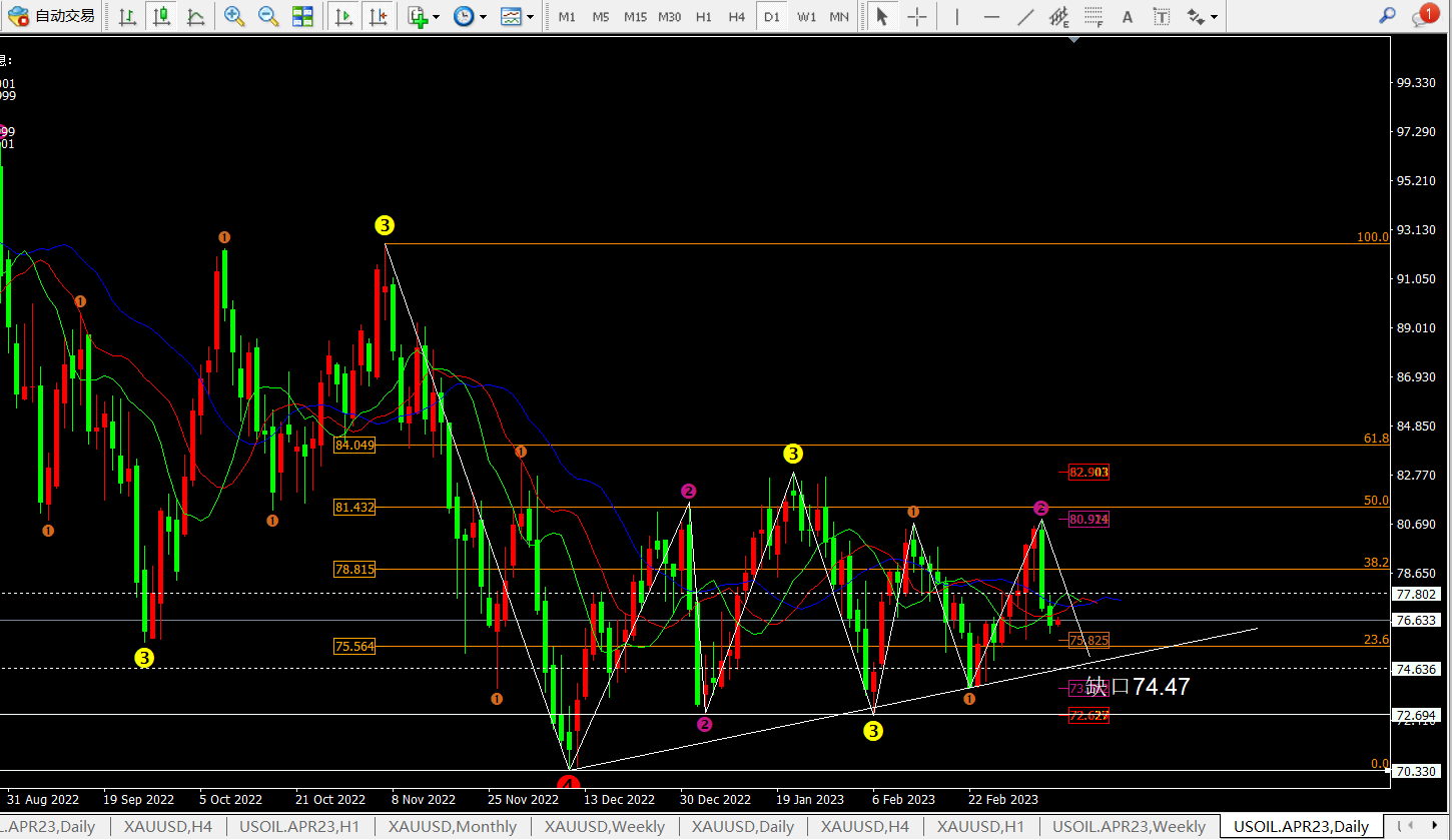 ② 周线裸“k”形态也可以看出价格属于收敛三角区间震荡,下方支撑在73.6一线。
