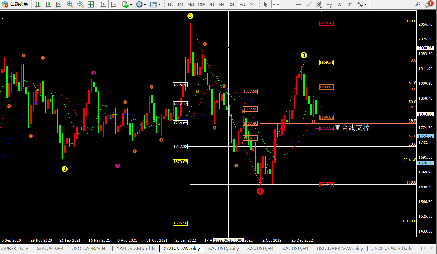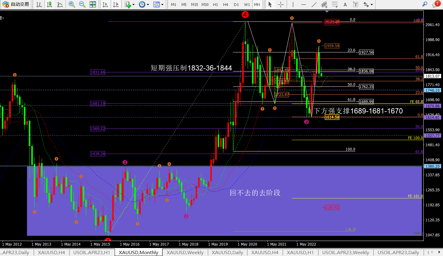 ① 短期价格维持在1787-1877区间震荡,鳄鱼指标三线放平也代表着震荡。短期压制在1827-1841附近。