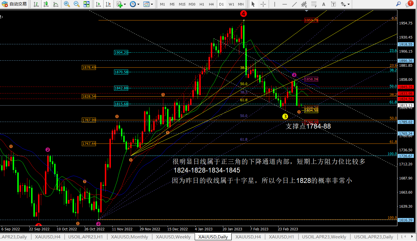③ 目前日线的组合形态看:当前支撑1784-87一线,其次是1800附近。而压制点比较明显1824-1828-1834-1845.