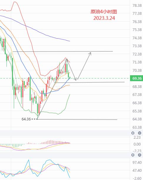 原油昨日小幅震荡上行至71.7一线后遇阻回调修整,日线收了一根小阴柱,布林带大开口,KDJ指标形成金叉,价格是一个上行的走势,需关注布林带中轨一线的压制情况,若不破价格还是偏弱势。4小时图中来布林带缩口,KDJ指标死叉放量,价格短线震荡修整。小时图中来看布林带开口,KDJ指标死叉放量,先关注下行情况。日内上方关注70.6/73.7/74.5一线压力情况,下方关注67.8/66.4/64.1一线的支撑.