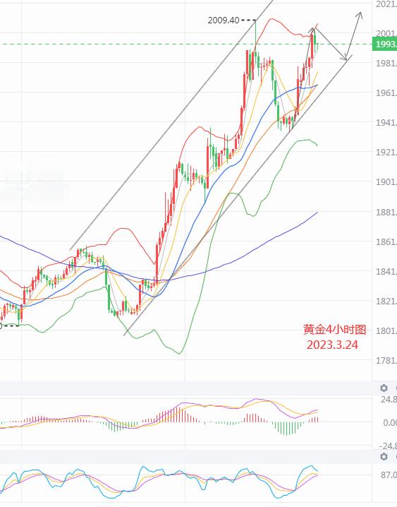 黄金昨日延续凌晨涨势继续小幅震荡上行,尾盘再次上行至2000关口处,日线收一根中阳柱,布林带大开口,KDJ指标相互缠绕,价格在小幅回调修正后维持上行走势。4小时图中来看布林带开口,KDJ指标欲形成死叉,短线小幅回调修正后预计仍以上行为主。小时图中来看布林带开口,KDJ指标形成死叉,继续关注上行情况。日内下方关注1985/1964/1936的支撑情况,上方关注1999/2009/2016的压力情况.
