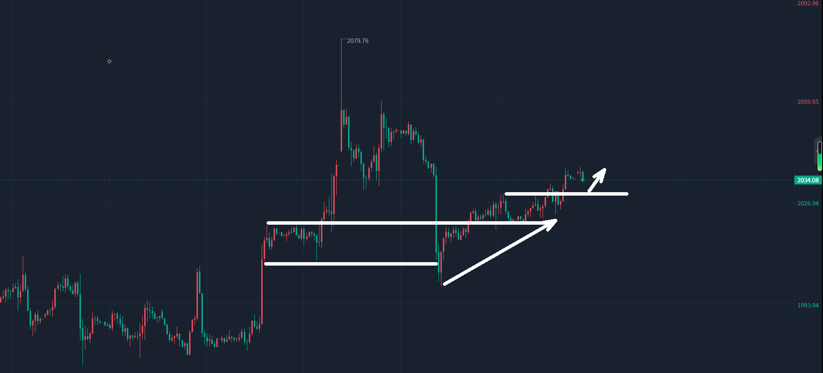 目前周三,周三是周中,本周前两个交易日震荡整理慢涨,周三防范回撤的风险,不盲目跟多,下方关键点关注2030一线,以及2022/20一线附近,若回踩止步跌幅,短多看反弹上行,若跌破2020一线,那么下方依旧具备回撤空间。